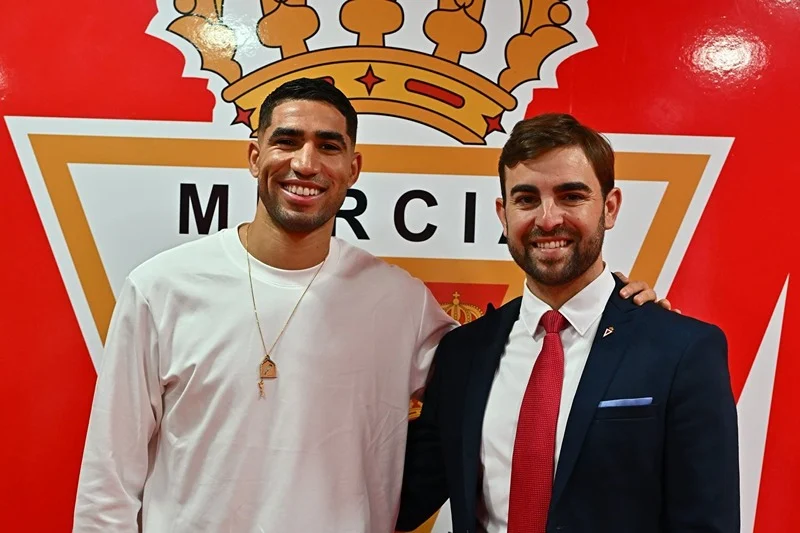 استغل النجم المغربي أشرف حكيمي فترة تعافيه من الإصابة ليقوم، يوم الأحد 16 نونبر، بزيارة إلى نادي ريال مورسيا الإسباني، حيث استقبله نائب رئيس النادي خوان خوسيه فرنانديز الذي نشر صورة توثق هذا اللقاء.