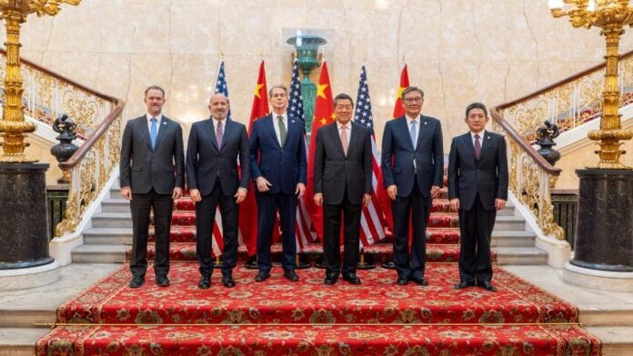ضم الوفد الأمريكي وزير الخزانة سكوت بيسنت ووزير التجارة هاوارد لوتنيك، والتقوا في قصر لانكستر بنائب رئيس الوزراء الصيني خه ليفنغ، وعدد من كبار المسؤولين التجاريين. وقد أكد الطرفان رغبتهما في تهدئة التوترات التجارية المتصاعدة.