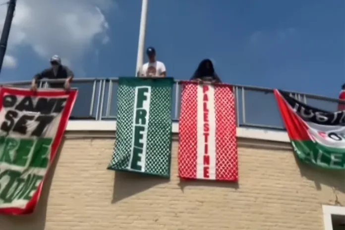 • الأعلام واللافتات: علق المحتجون أعلام فلسطين ولافتات كبيرة كتب عليها « فلسطين حرة ».