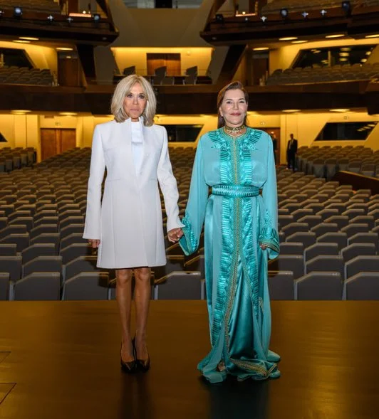 وكانت صاحبة السمو الملكي الأميرة للا حسناء في استقبال السيدة بريجيت ماكرون لدى وصولها إلى المسرح الملكي الرباط، حيث استعرضتا تشكيلة من القوات المساعدة أدت التحية.