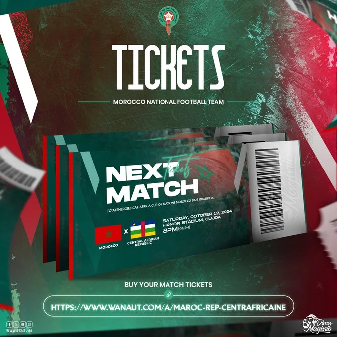 أعلنت الجامعة الملكية المغربية لكرة القدم عن بدء بيع تذاكر مباراة المنتخب الوطني لكرة القدم أمام منتخب أفريقيا الوسطى، والتي تُعدّ الجولة الثالثة من تصفيات كأس أمم أفريقيا 2025، ابتداءً من يوم السبت.