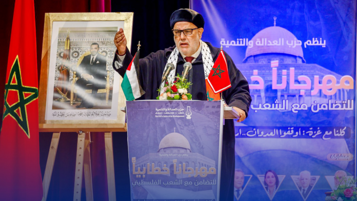 واعتبر ابن كيران أن المقاومة الفلسطينية تمثل رداً طبيعياً على الجرائم التي ترتكبها إسرائيل، وندد بالاعتداءات على المسجد الأقصى وتدنيسه. ووجه انتقادات لاذعة للقوى العالمية، خاصة الولايات المتحدة، داعياً إياها إلى مراجعة سياستها وتصحيح أوضاعها تجاه الشأن الفلسطيني والعالم العربي والإسلامي.