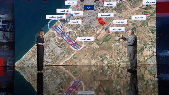 • محور نتساريم يفصل شمالي قطاع غزة عن وسطه وجنوبه، وقد بدأ عرضه بـ750 مترًا، ثم كيلومترين، والآن يُوسع إلى 4 كيلومترات.