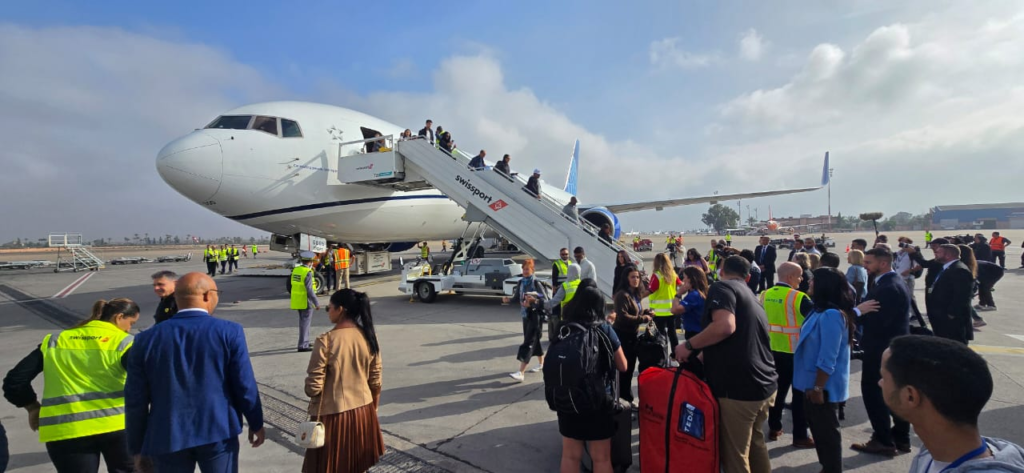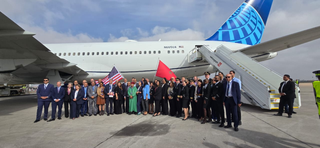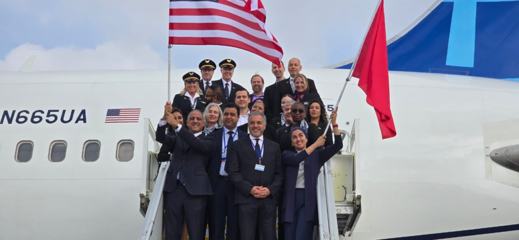 كما أشار المصدر إلى أنه « احتفاءً بتدشين هذا الخط الجوي الجديد، شهدت الرحلة الافتتاحية وصول وفد رفيع المستوى من شركة يونايتد إيرلاينز، برئاسة باتريك كوايل، نائب رئيس الشبكة الدولية، حيث تم استقبالهم بحفاوة في مطار مراكش من قِبل وفد مغربي رفيع، يضم أطقم المكتب الوطني المغربي للسياحة وبعض الفاعلين في القطاع السياحي، بقيادة حميد بن الطاهر، رئيس الكونفدرالية الوطنية للسياحة ».