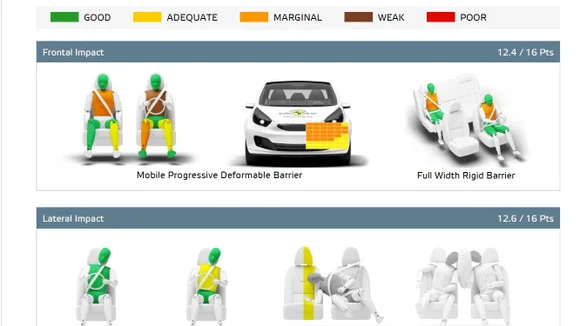 في اختبار التصادم الأمامي غير المتماثل، ظلّت المقصورة مستقرة، غير أن حماية صدر السائق وُصفت بـ«الضعيفة»، و«المتوسطة» بالنسبة للراكب الأمامي.