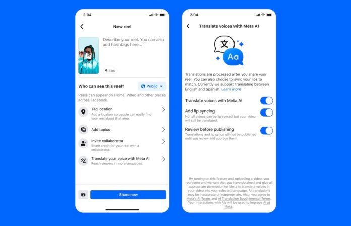 أعلنت شركة « ميتا »، المالكة لفيسبوك وإنستغرام، عن إطلاق ميزة جديدة تعتمد على الذكاء الاصطناعي، تتيح دبلجة الصوت في مقاطع الفيديو القصيرة (Reels) إلى لغات مختلفة، مع مزامنة لحركة الشفاه.