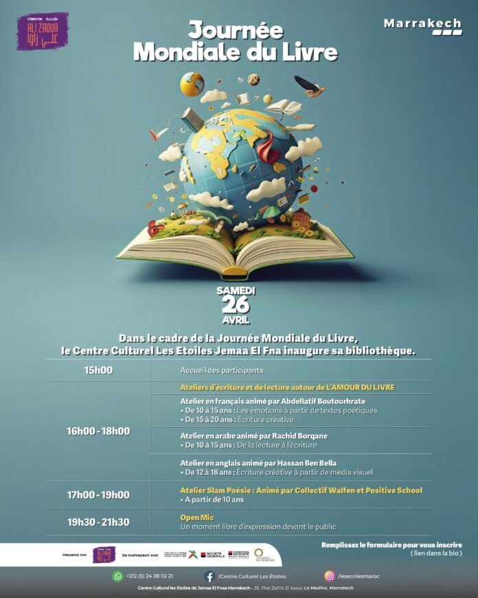 يوم السبت 26 أبريل، يدعوكم المركز الثقافي « النجوم جامع الفنا » لتجربة فريدة مخصصة للأدب وتبادل الأفكار حول الكلمات. من بعد الظهر، سيستضيف هذا الفضاء الثقافي الحيوي ورش عمل متنوعة مفتوحة للجميع، سواء كانوا من عشاق القراءة أو الكتابة أو الإبداع الأدبي.