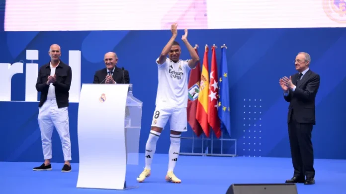 كان والدا مبابي حاضرين إلى جانب أساطير النادي السابقين، من بينهم زين الدين زيدان وراؤول غونزاليس، لمشاهدة التقديم الرسمي. تم عرض الألقاب الخمسة عشر لدوري أبطال أوروبا التي حققها الفريق الملكي.