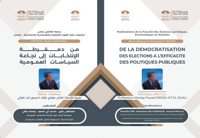 صدر أخيرا ضمن منشورات كلية العلوم القانونية والاقتصادية والاجتماعية بمراكش، عن وعن مختبر الدراسات الدستورية وإدارة الأزمات والسياسات ، ومجموعة البحث حول الإدارة والسياسات العمومية ، مؤلف جماعي، تحت عنوان « من دمقرطة الانتخابـات إلى نجاعـة السياسات العمومـية »، من تنسيق الأستاذ مصطفى جاري ومحمد أبي السرور ومصطفى بنعلي، وهو يتضمن مساهمات علمية مختلفة تكريم الأستاذ الراحل مولاي فؤاد ادريسي أيت الوالي.