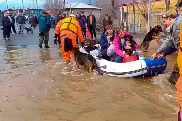 تقوم فرق الطوارئ بإجلاء السكان المحليين مع حيواناتهم الأليفة بعد انهيار جزء من السد الذي أدى إلى فيضانات في أورسك الروسية.