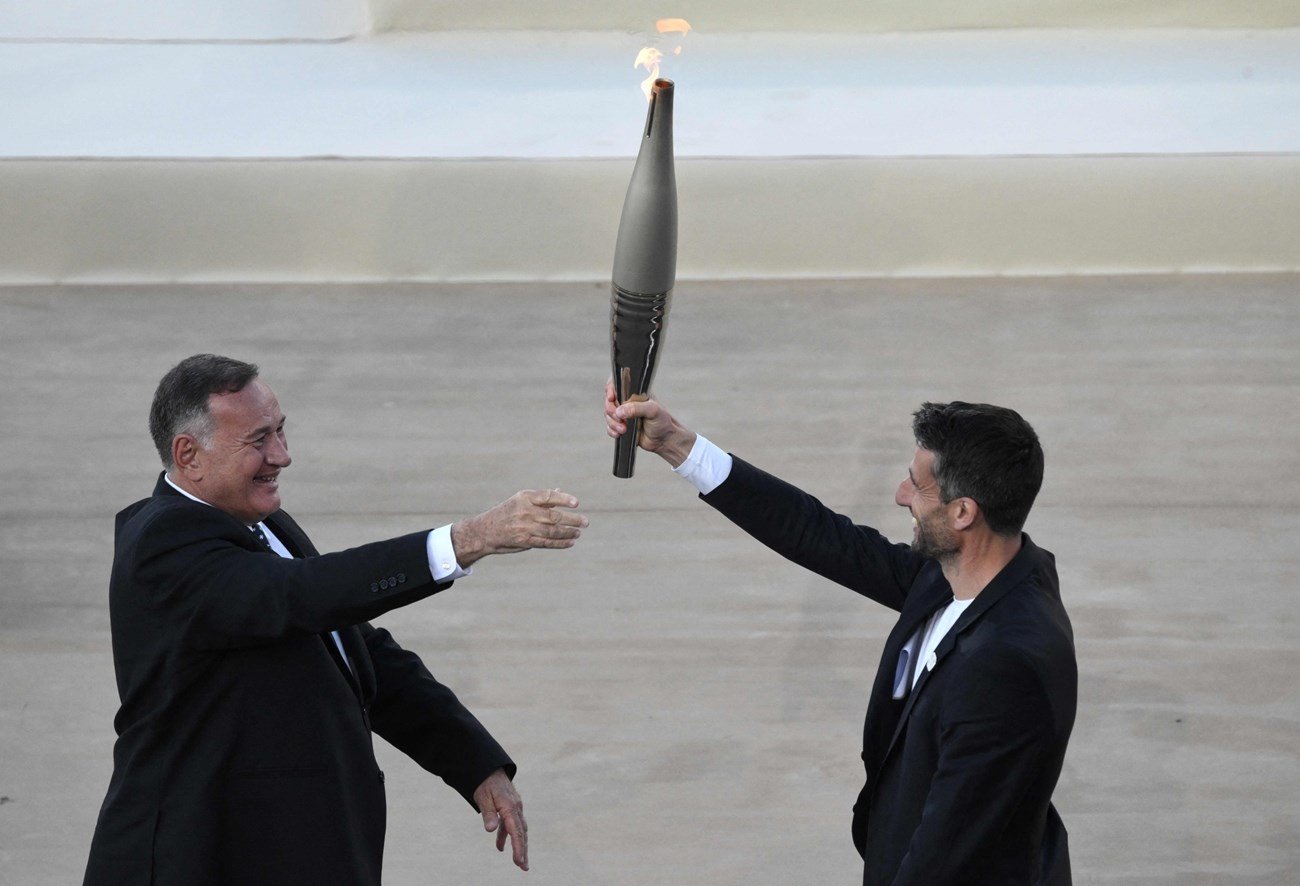في مراسم احتفالية أُقيمت في ملعب باناثينايكو في أثينا، تم تسليم الشعلة الأولمبية من قبل رئيس اللجنة الأولمبية اليونانية، سبيروس كابرالوس، إلى رئيس لجنة ألعاب باريس، توني إستانغيه. وألقى إستانغيه، الفائز بثلاث ميداليات ذهبية أولمبية في رياضة الكانوي-كاياك خلال ألعاب سيدني 2000 وأثينا 2004 ولندن 2012، كلمة أكد فيها أن هدف باريس هو تنظيم « ألعاب مذهلة لكن أكثر مسؤولية أيضًا »، مما سيسهم في بناء مجتمع أكثر شمولًا.